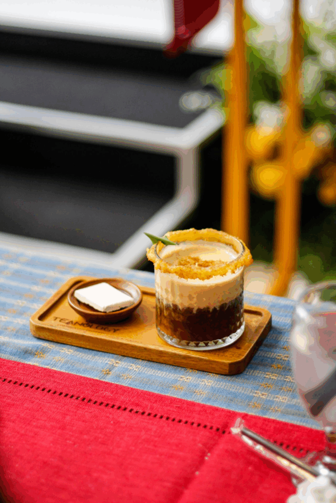 👉 Our colenak-inspired tea mocktail is made of organic black tea, cloves, ginger, cinnamon, palm sugar, coconut cream, fermented cassava (peuyeum / tapai)